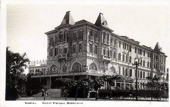 Pouco tempo depois da foto abaixo, feita por volta de 1970 (incluindo os anexos laterais, que não faziam parte da obra original), esse famoso hotel no final da Avenida Ana Costa, junto à praia do Gonzaga, seria demolido para a construção do centro de compras Parque Balneário, complexo que inclui um hotel de linhas modernas mas com o tradicional nome e três prédios de apartamentos com frente para o mar. Esse complexo foi inaugurado em 1977 e posteriormente foi vendido ao grupo Mendes, dono também dos hotéis Mendes Plaza e Mendes Panorama, do Centro de Convenções Mendes e de outras instalações na Baixada Santista.
