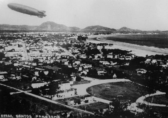 Em 11 de maio de 1933, o dirigível Graf Zeppelin sobrevoou a cidade de Santos, num desvio de rota em que também passou pela capital paulista. Nesta foto, aparece em primeiro plano o hospital da Santa Casa na Av. Dr. Cláudio Manoel da Costa, então ainda em construção, e o campo da Associação Atlética Portuguesa, tendo ao fundo o Morro de Santa Terezinha e a Praia do José Menino.