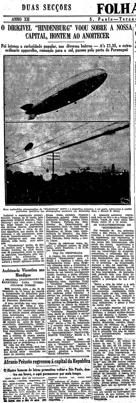 Indizível o espetáculo proporcionado, ontem às 19 horas, pelo gigantesco dirigível alemão Hindenburg, que voou sobre a Capital, longo tempo. As populações dos diversos bairros, alegremente alvoroçadas com a visita do genial aparelho, que enchia de sua presença o céu paulistano, puseram-se imediatamente à rua, para deliciar-se com esse espetáculo, aliás muito raro entre nós.