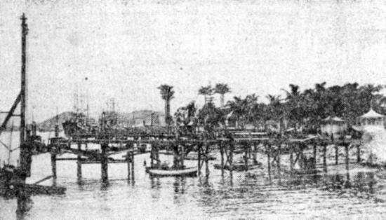 | Antes da instalação do porto organizado em 1892, Santos contava com precários trapiches de madeira para o acesso aos navios