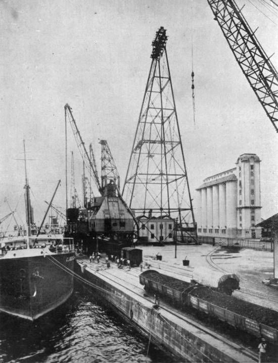 Silos para trigo nos Outeirinhos e respectivos descarregadores no cais, em 1931: