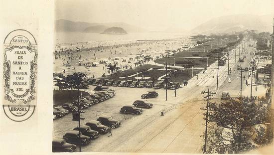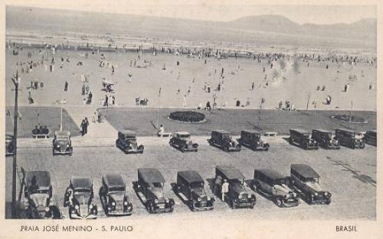 Este cartão-postal editado no ano de 1942 pela Comissão Brasileira dos Centenários de Portugal mostra um trecho da praia do José Menino, com estacionamento de carrões da época,