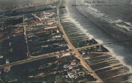 Raro cartão-postal aéreo das praias do José Menino e do Gonzaga, em 1910. A imagem, que também existe com outra palheta de cores, mostra a avenida da praia
