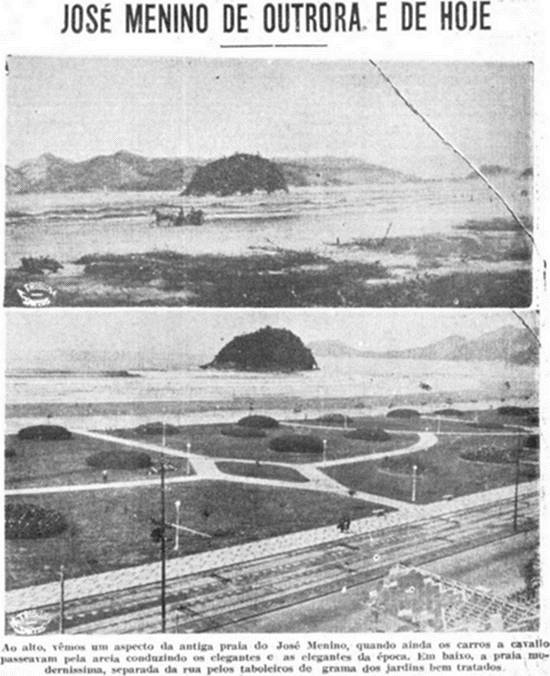 "Ao alto, vemos um aspecto da antiga praia do José Menino, quando ainda os carros a cavalo passeavam pela areia conduzindo os elegantes e as elegantes da época. Em baixo, a praia moderníssima,