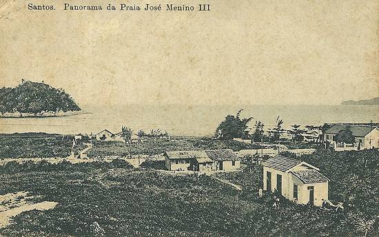 "Aspecto da praia do José Menino, tendo ao fundo uma parte da Ilha Urubuqueçaba e à direita a Ponta do Itaipu (Praia Grande). O cartão postal é de 1913. Note as casas rústicas, de
