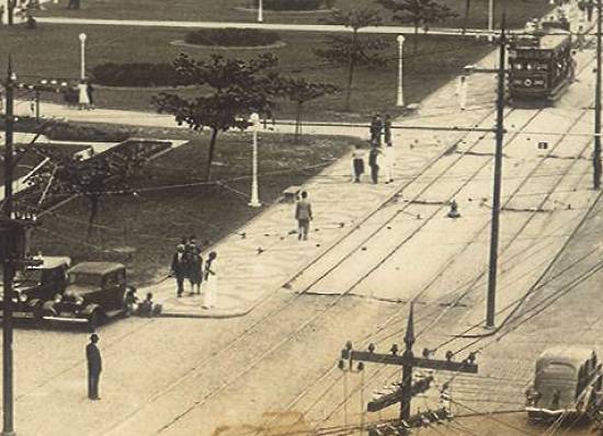 Ainda na década de 1940, a praia do José Menino, com uma pista para automóveis e as duas faixas para trilhos de bondes junto ao passeio da área ajardinada. Ao fundo,