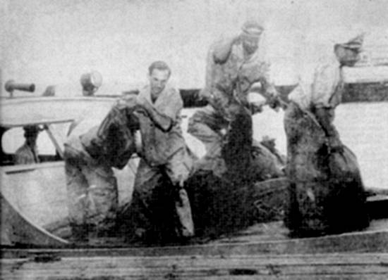 Na segunda foto, agentes fiscais descarregam de sua lancha de patrulha o contrabando que apanharam no porto de Santos, em 1960: