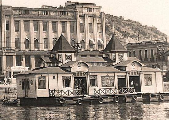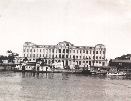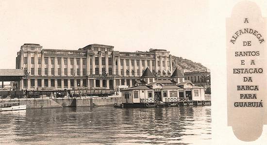 O prédio da Alfândega, em foto não datada, possivelmente da década de 1930, visto pelo lado de mar, observando-se ainda o flutuante usado como embarcadouro para as barcas destinadas ao Guarujá: