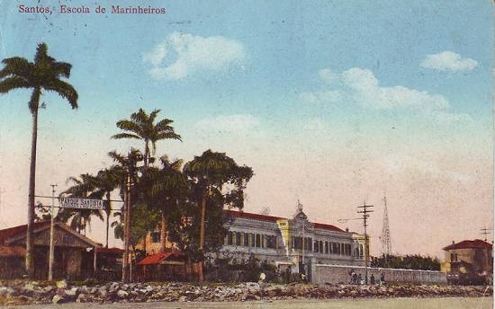 Santos já teve uma Escola de Aprendizes-Marinheiros, que em 6/9/1909 foi inaugurada num prédio construído sobre as ruínas do Forte Augusto. O prédio abrigou ainda por duas décadas o Instituto de Pesca Marítima e em seguida o Museu de História Natural e o Museu de Pesca, que é seu uso mais recente. Nesta foto, reproduzida da publicação Liga Marítima de junho de 1909/dezembro de 1910, aprendizes se exercitam no mastro defronte do edifício, em 1910: