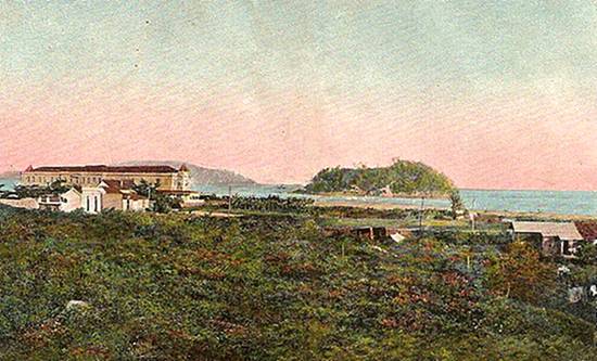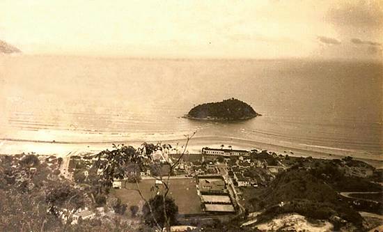 Esta foto foi feita em 28 de janeiro de 1938, mostrando a praia, o hotel e a ilha Urubuqueçaba: