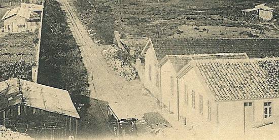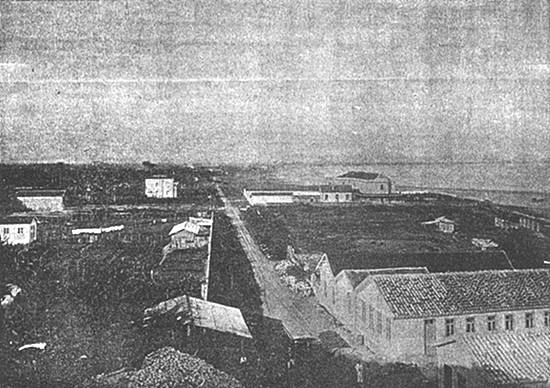 trilhos da linha de bondes puxados a burros. Note ainda, em primeiro plano, casas de pescadores...":