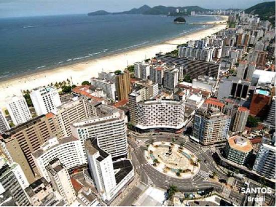 centro. À direita, as praias vicentinas e a Ilha Porchat, e ao fundo a cidade de Praia Grande: