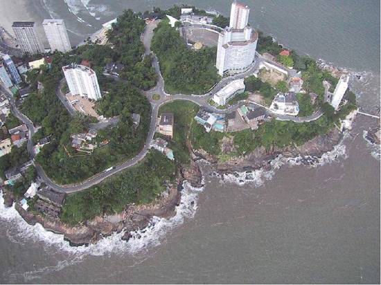 praias e a Ilha Urubuqueçaba, tendo ao fundo as praias vicentinas: