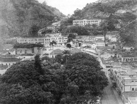 cerca de três anos antes do desabamento parcial do morro, vendo-se ainda o terceiro hospital da