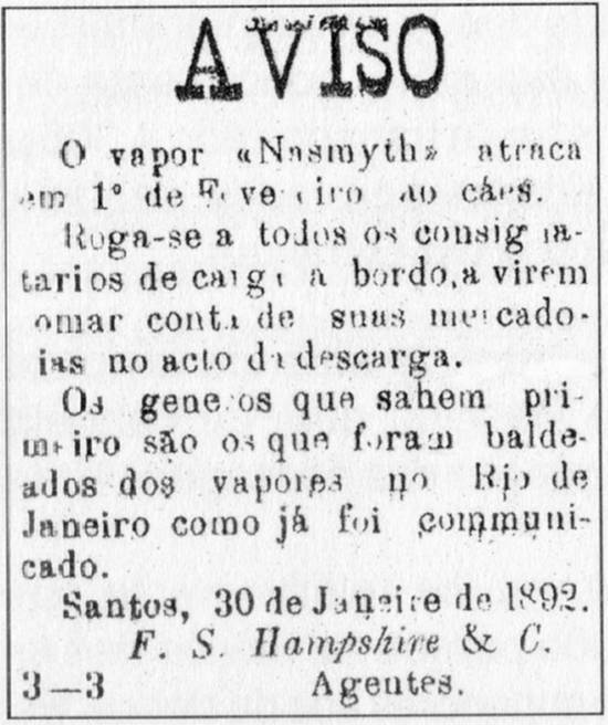 Anúncio dos agentes do navio, em um jornal santista da época