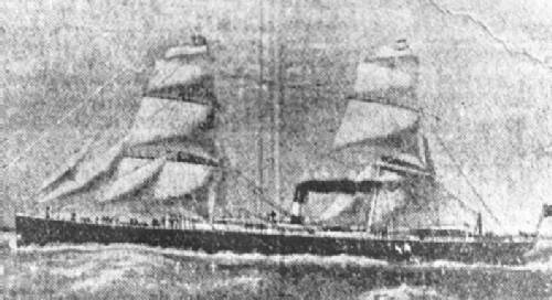 O navio, identificado como Nasmyth, com as velas desfraldadas e o apoio da propulsão a vapor