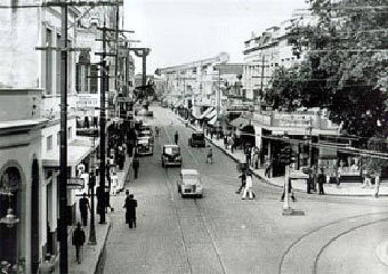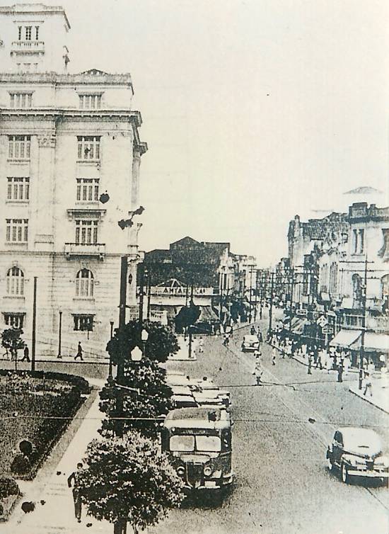 O Palácio José Bonifácio (visto à esquerda na foto), a Praça Mauá (em primeiro plano) e a Rua General Câmara, vista na década de 1940 em direção ao