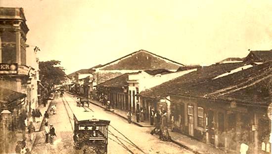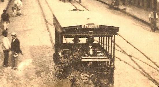 O bondinho, com tração animal, na linha para a então Rua São Francisco: