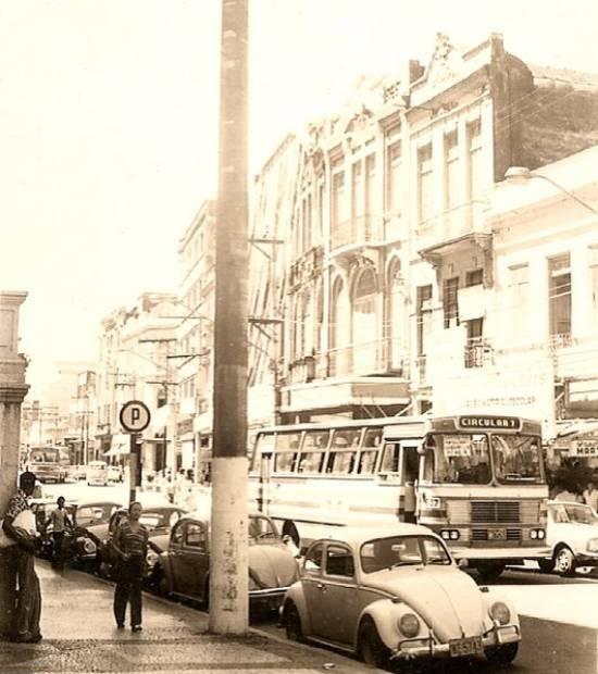 Rua General Câmara em 1902: o bondinho a tração animal se detém em local próximo à atual Rua Frei Gaspar. A via, que também foi