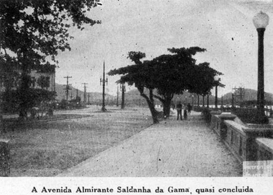 A mesma revista Flama de 1945 publicou um anúncio da Prefeitura Municipal de Santos, mostrando a fase final das obras na Avenida Almirante Saldanha da Gama. Dentro da água, as obras do trampolim: