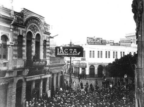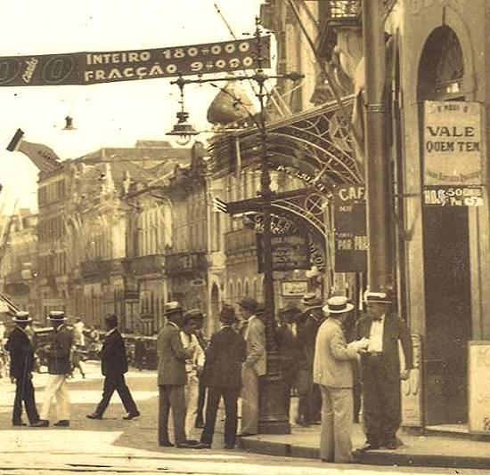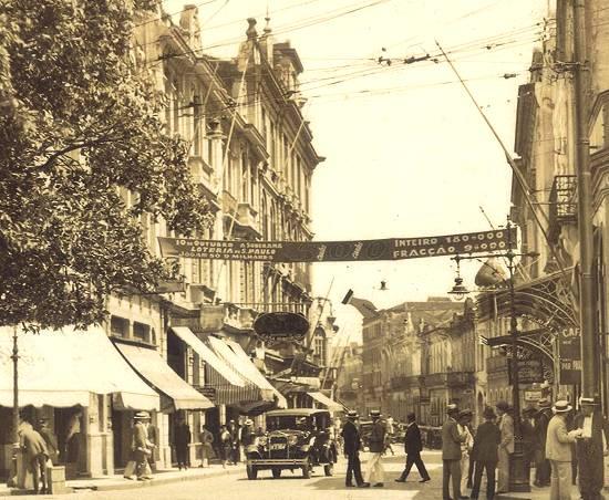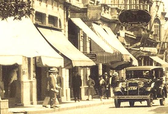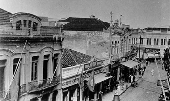 Já no início da década de 1930, o pormenor de uma imagem de cartão postal mostra a confluência da Rua do Comércio com a Praça Rui Barbosa, atravessada por um cartaz