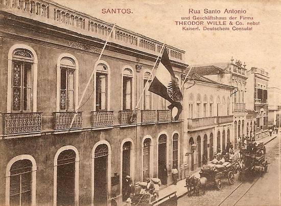Já este cartão postal alemão retrata outro trecho da rua, destacando a comissária de café Theodor Wille & Co., onde também funcionava o consulado alemão em