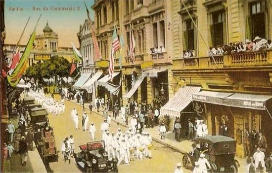 do Comércio e à Praça Rui Barbosa. A ambientação e o ângulo da imagem, destacando o Lloyd Real Belga, sugerem que poderia estar aí registrada a visita a Santos dos reis da Bélgica, ocorrida em