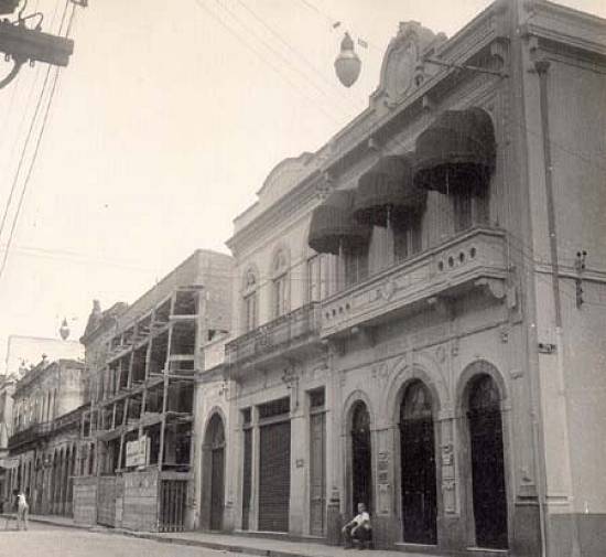 Esquina das ruas do Comércio e José Ricardo, na mesma época. O prédio vermelho era a sede da Companhia Bandeirantes de Armazéns Gerais: