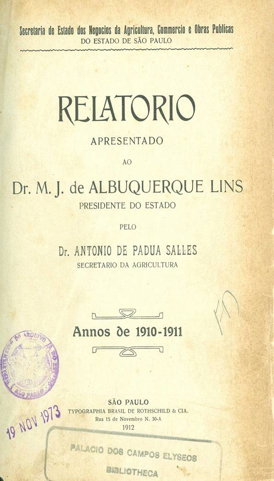 Paulo, este Relatório apresentado ao dr. M. J. de Albuquerque, presidente do Estado, pelo dr. Antonio de Padua Salles, secretário da Agricultura - Anos de 1910-1911, impresso em 1912 na Typographia Brasil de Rothschild & Cia., inclui fotos