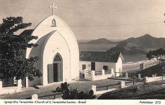 Este cartão postal é do início da década de 1950, e além da capela e seus arredores, permite vislumbrar trechos das praias vicentinas, a Ilha Porchat e áreas de