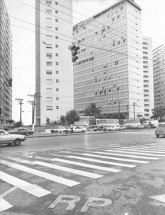 Em 1977, a confluência da Avenida Pinheiro Machado (canal 1) com a via da praia (Avenida Presidente Wilson, vista à direita na foto, em direção ao Gonzaga):