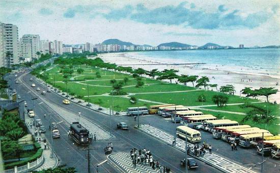 Este cartão postal de 1966 mostra o estacionamento domingueiro regulamentado dos ônibus que transportavam para Santos os chamados "turistas de um dia" ou "farofeiros", por levarem