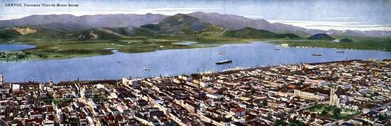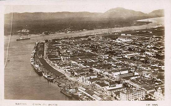 "Aspecto parcial de Santos, abrangendo o centro do nosso alto comércio, e onde se desenvolve a febril atividade dos grandes negócios do maior mercado exportador de café do mundo. Vê-se ao fundo a