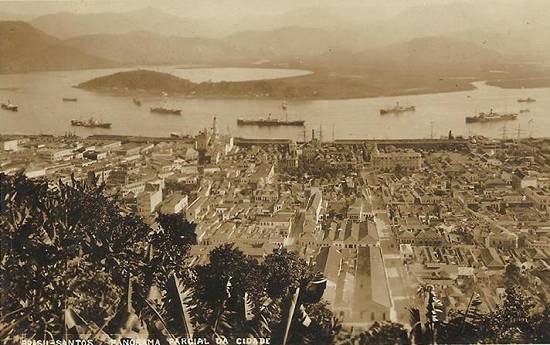 Nessa época, ainda aportavam navios mercantes a vela no porto santista, sendo os mastros de dois deles vistos (ao centro e à direita) neste cartão postal de 1930 (a imagem foi obtida desde o