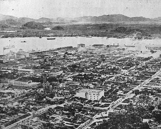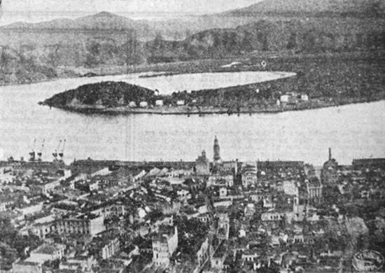 Santos, em frente à Praça José Bonifácio, bastante arborizada. Note também o outro lado do canal do estuário, com os terrenos ainda desocupados e onde hoje estão diversos terminais portuários, a Base Aérea e