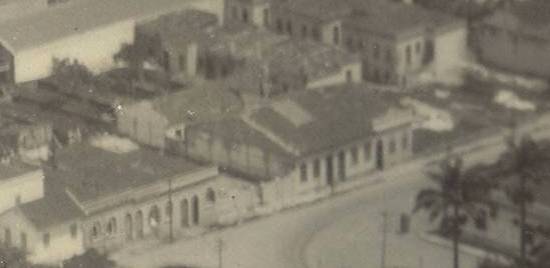 Valongo e ao lado a estação ferroviária, semi-encoberta pelos prédios onde então ainda funcionavam Prefeitura e Câmara: