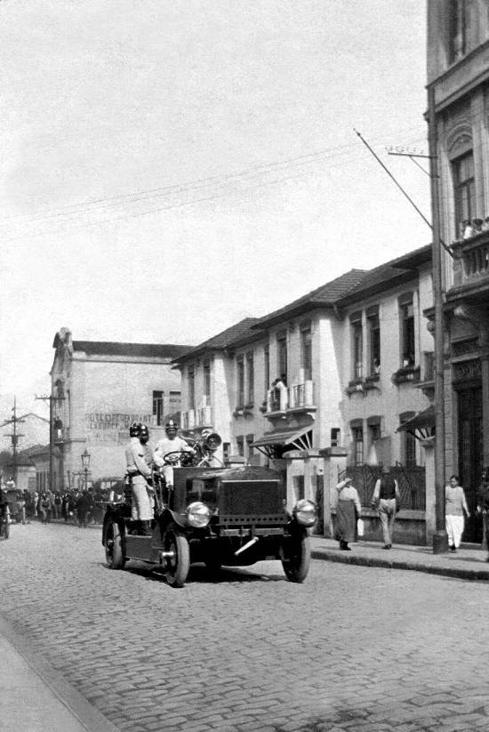 cidade de Santos: os bombeiros chegam para apagar um incêndio. Nesta foto, é possível perceber ao fundo o cartaz do hotel