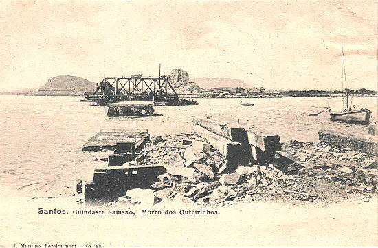 Nesta vista panorâmica do Macuco, do início do século XX, obtida pelo fotógrafo José Marques Pereira, ainda são vistos os dois outeiros que dominavam a paisagem, junto ao Estuário, e que seriam depois desaterrados durante as obras de ampliação do porto santista, fase essa concluída em 1909 (na parte junto à linha d'água):