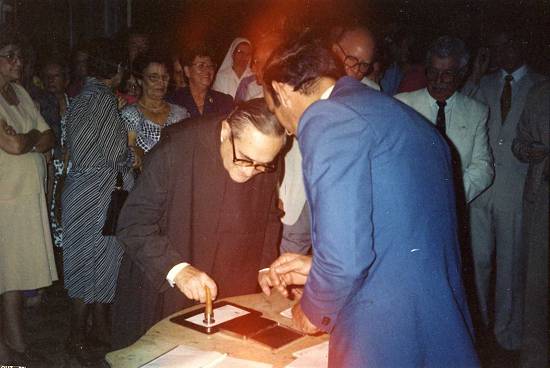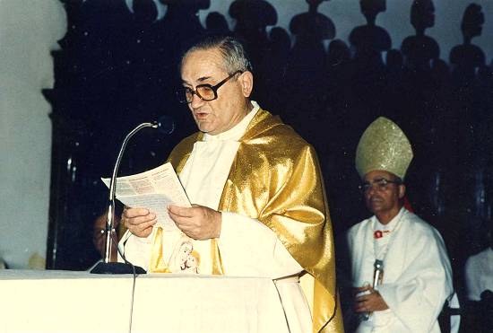 Bispo de Santos, d. David Picão, lê mensagem, ouvida por frei Rafael M. Marinho, no seu jubileu de ouro (50 anos) de profissão religiosa, em 2 de fevereiro de 1992