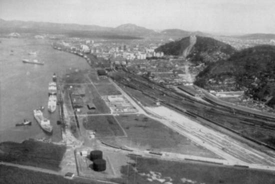 mais ao fundo o Cais destinado aos navios petroleiros e descarga de minérios a granel. À direita destaca-se a Ilha do Barnabé, com suas instalações