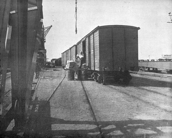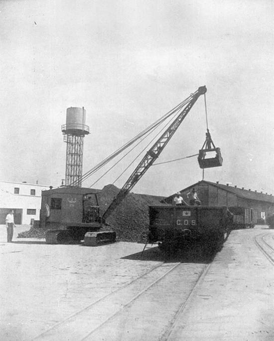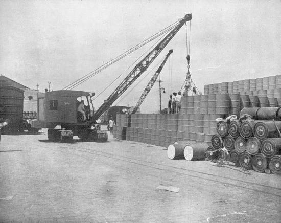 Guindaste sobre lagartas, de 9 toneladas, operando no embarque de minério. Vê-se ao fundo o reservatório de água da instalação contra incêndio Sprinkler do armazém externo VII-A, de juta e outras fibras
