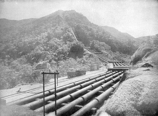 Canalizações condutoras de água para as cinco turbinas da usina de Itatinga. A água é