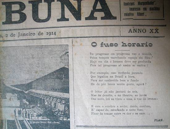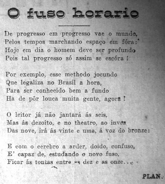 O advento do padrão de horário e seus fusos - com toda a confusão natural que se criou em torno disso - foi também destacado em Santos. Na época, o jornal santista A Tribuna mantinha no alto de sua primeira página uma espécie de editorial diário em versos, assinado por um certo Plan - que era o pseudônimo usado pelo jornalista Otávio Veiga. E, numa sexta-feira, o dia 2 de janeiro de 1914 (ao lado da foto de um novo equipamento instalado no cais santista), foi esse o tema: