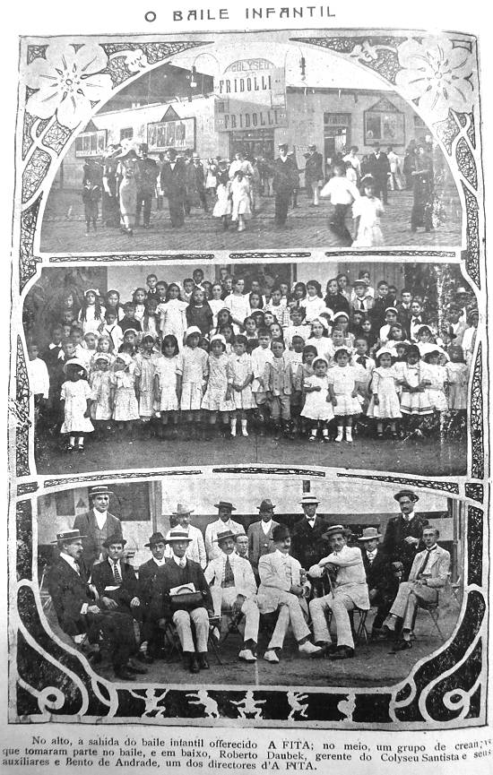 Antes das instalações atuais do Cine-Teatro Coliseu, erigidas em 1924 na confluência das Ruas Braz Cubas e Amador Bueno com a Praça José Bonifácio, existiu no mesmo local um outro Coliseu, criado em 1909 por Francisco Serrador, que aparece nestas raras imagens, publicadas pela revista santista A Fita, que ali promoveu um baile infantil em 1911. Esta página foi publicada na edição número 6 da revista, de 1º de setembro de 1911: