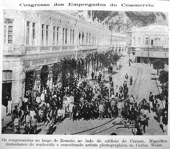 "Os congressistas no Largo do Rosário, ao lado do edifício do Correio. Magnífico instantâneo do conhecido e conceituado artista fotográfico, sr. Carlos Weise"