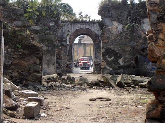 De dentro, podem ser vistos os destroços, as paredes quebradas e, ao fundo, uma das torres do prédio da Bolsa de Café