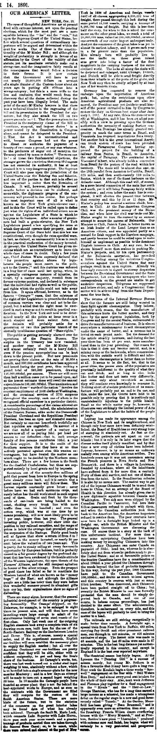 Os olhos dos americanos sérios estão atualmente fixados com extremo interesse, não sobre as próximas eleições, que na maioria das vezes são uma mera disputa entre os "entrados e os saídos" (N.E.: "the ins and the outs" é expressão inglesa para indicar os políticos cujo mandato está em vigor e aqueles cujo mandato já expirou), mas sobre a Suprema Corte dos Estados Unidos, já que várias questões de importância extraordinária serão discutidas e decididas dentro das próximas semanas. Uma delas é a constitucionalidade da Lei McKinley e, embora o peso da probabilidade seja fortemente a favor de uma afirmação do Tribunal pela validade do referido estatuto, seus adversários certamente fazer um caso forte, e a imaginação recua bastante face às conseqüências que se seguiriam à decisão em seu favor.