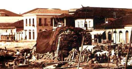 À beira d'água, amontoada, uma grande pilha de sacas, possivelmente de café