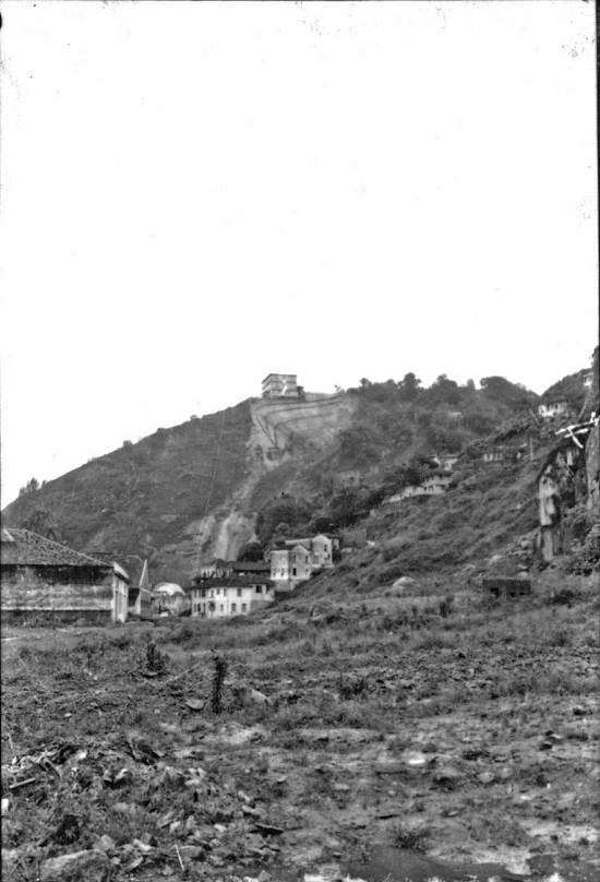 "Aspecto do deslizamento do barranco argiloso que ocorreu no ano de 1956" - encosta do Monte Serrat, próximo ao túnel, área da antiga Santa Casa. Os restos da escadaria foram preservados
