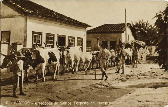 Possivelmente da mesma época é este cartão postal produzido na Itália, com cerca de 9 x 14 cm, mostrando uma boiada em Santos: